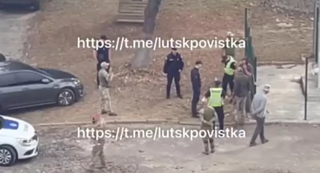 На опубликованных кадрах «футбольная команда», состоящая из полицейских и тэцэкашников, приехала забирать одного украинца.