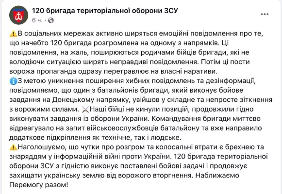 Но там всё же признали, что один из батальонов бригады на Донецком направлении «вошел в сложное и непростое столкновение» с россиянами, но ВСУ «не бросили позиций, продолжили достойно выполнять задачи по обороне Украины», а командование бригады «мгновенно отреагировало на запрос солдат батальона и уже направило дополнительное подкрепление как техническое, так и человеческое».