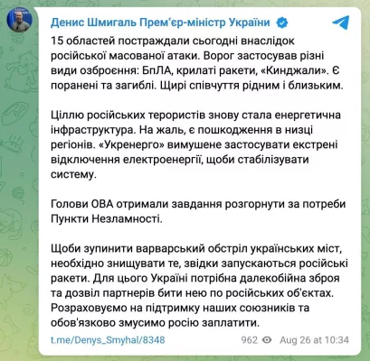 Он написал, что целью атаки была энергетика, применялись крылатые ракеты, «Кинжалы» и беспилотники.