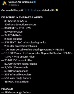 Продолжается поставка ПВО (ЗСУ Гепард) и боеприпасов к нему. БПЛА и боеприпасы для артсистем как обычно являются базовыми компонентами. Отметим, что на данный момент поставлено 50 ЗСУ Гепард (Gepard/Cheetah) и 292 000 снарядов к ним. Всего: для 155-мм артсистем поставлено 427 000 снарядов, для 122-мм артсистем поставлено 23 000 снарядов, для 120-мм минометов поставлено 34 000 мин.