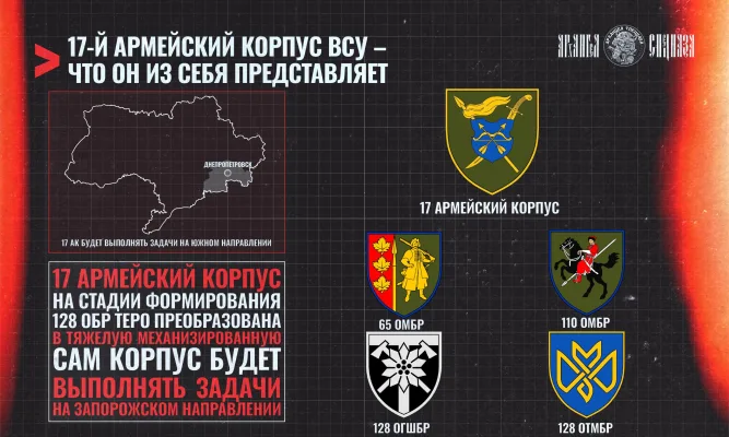 Данный корпус будет выполнять задачи на Запорожском направлении. Учитывая наши успехи на участке Каменского, от 17 АК будут ждать высоких результатов, для чего его комплектуют техникой и людьми.