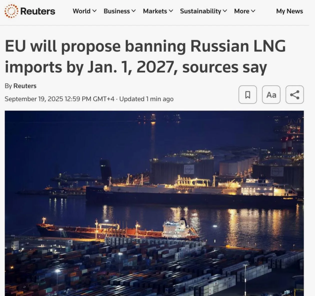 Еврокомиссия в рамках 19-го пакета санкций предложила запретить импорт российского СПГ с 1 января 2027 года – на год раньше, чем планировалось.