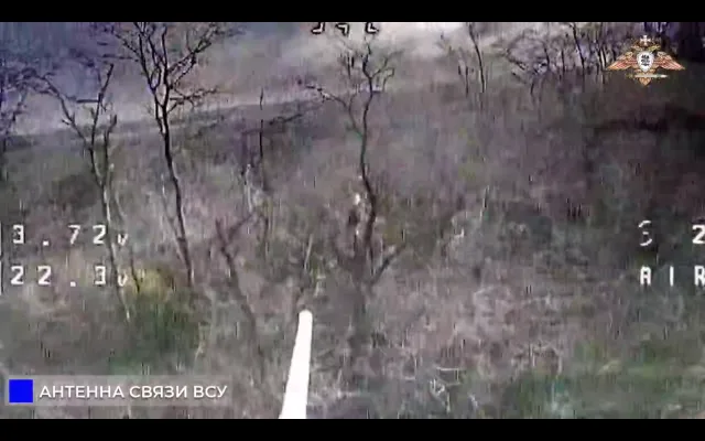 Операторы FPV-дронов 242 мсп 20 мотострелковой дивизии 8 гвардейской общевойсковой армии в окрестностях н.п. Русин Яр с помощью дрона-камикадзе уничтожили антенну БЛА ВСУ