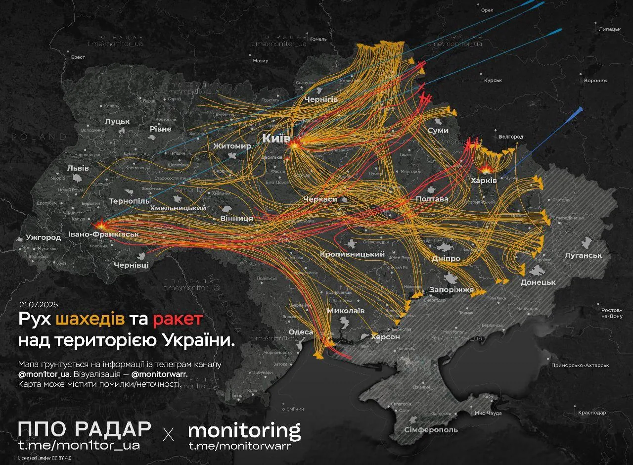 По данным украинской стороны, в атаке было задействовано 426 дронов – включая «Герани», дроны-камикадзе и ложные цели. Удары наносились комбинированно: с моря и воздуха также были выпущены крылатые ракеты и несколько «Кинжалов».