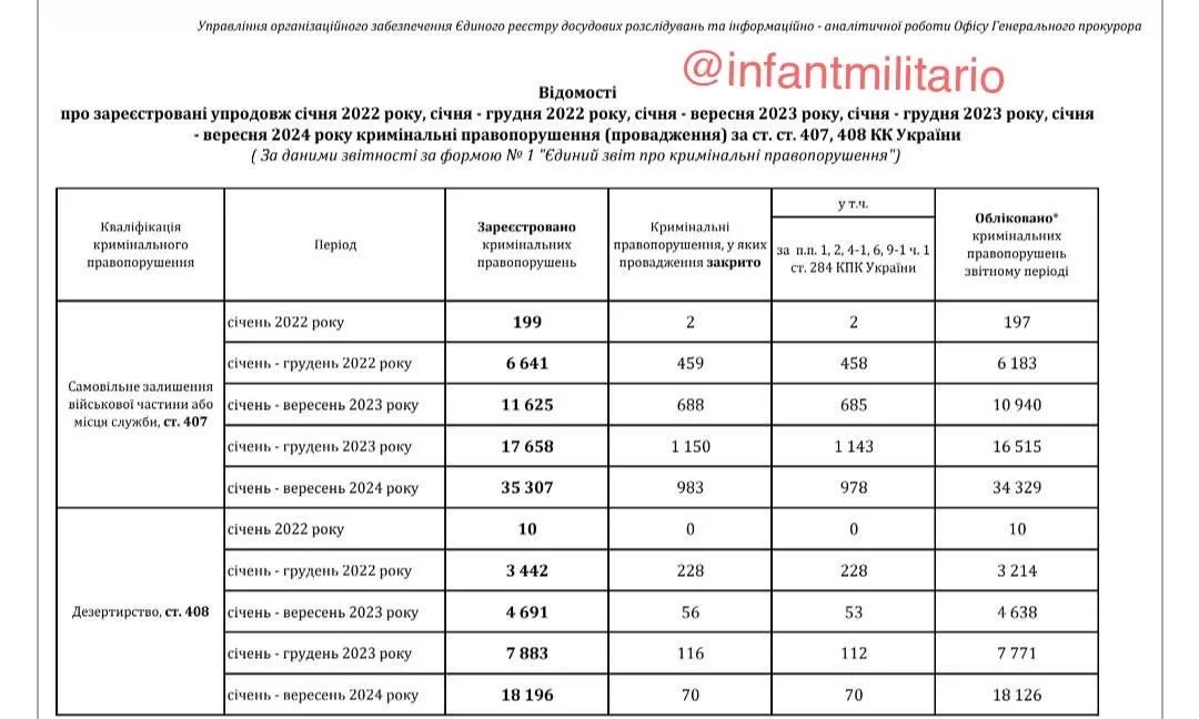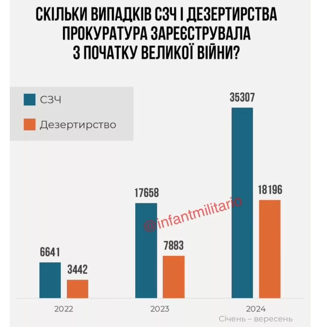 Со ссылкой на Офис Генпрокурора, сообщается, что за январь-сентябрь 2024 года зарегистрировано в три раза больше случаев СОЧ и почти в четыре раза – дезертирства, чем за аналогичный период прошлого года.