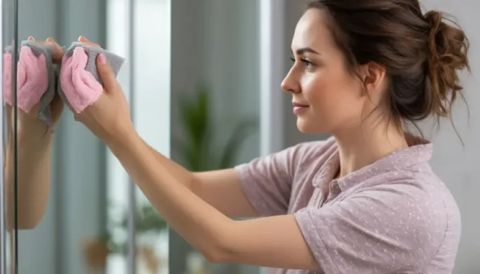 Уксус в составе раствора эффективно растворяет известковые отложения, жирные пятна и дезинфицирует поверхность. Средство для мытья посуды помогает справиться с стойкими загрязнениями, а финальная полировка мягкой тканью придаёт стеклу и зеркалу идеальный, безупречный блеск.
