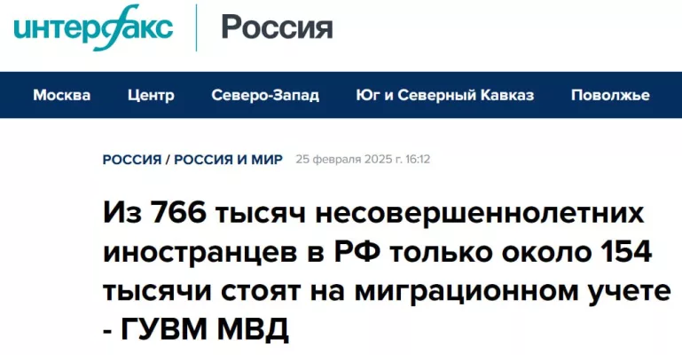 Из 766 тыс. несовершеннолетних иностранцев в России на учёте состоят лишь 154 тыс. — остальные 80% нарушают законодательство, — сообщил замначальника Главного управления по вопросам миграции МВД.