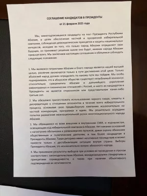 В преддверии второго тура президентских выборов два главных кандидата — Бадра Гунба и Адгур Ардзинба — подписали совместное соглашение в целях «проведения честной и прозрачной избирательной кампании».
