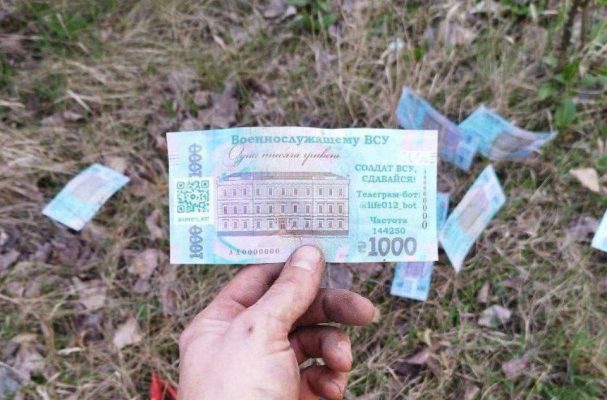 Хороша эта воплощенная идея. Бумажка привлекает внимание схожестью с украинскими деньгами. Рассчитано на то, что её захочется поднять. А там уж и информацию прочитает. Если же что толковое удумает всушник, то её можно спрятать вместе с деньгами.