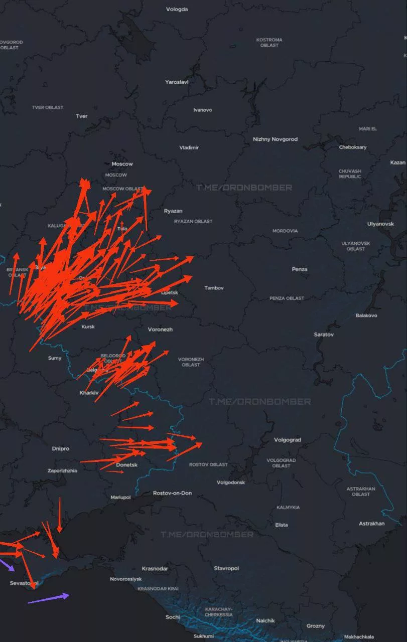 Забавно, как свидомые пропагандисты ноют по поводу российского массированного удара, а параллельно публикуют карту запусков своих дронов по России. Это, конечно, другое.