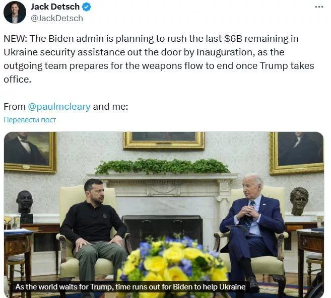Politico сообщает, что администрация Байдена планирует за оставшееся до инаугурации Дональда Трампа время отправить Украине военную помощь на 6 миллиардов долларов.