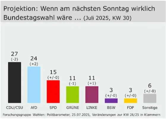 С конца июня «АдГ» в опросе набрала два процентных пункта и с результатом в 24% оказалась на втором месте в рейтинге политических партий Германии – ее лучший результат с апреля.