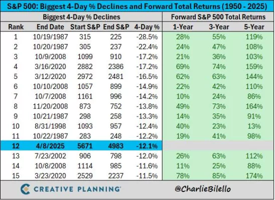 Но забавно другое — ВСЕГДА в истории после подобных обвалов в течении года, трех и пяти рынок рос, причем превышая значения на которые раньше падал.