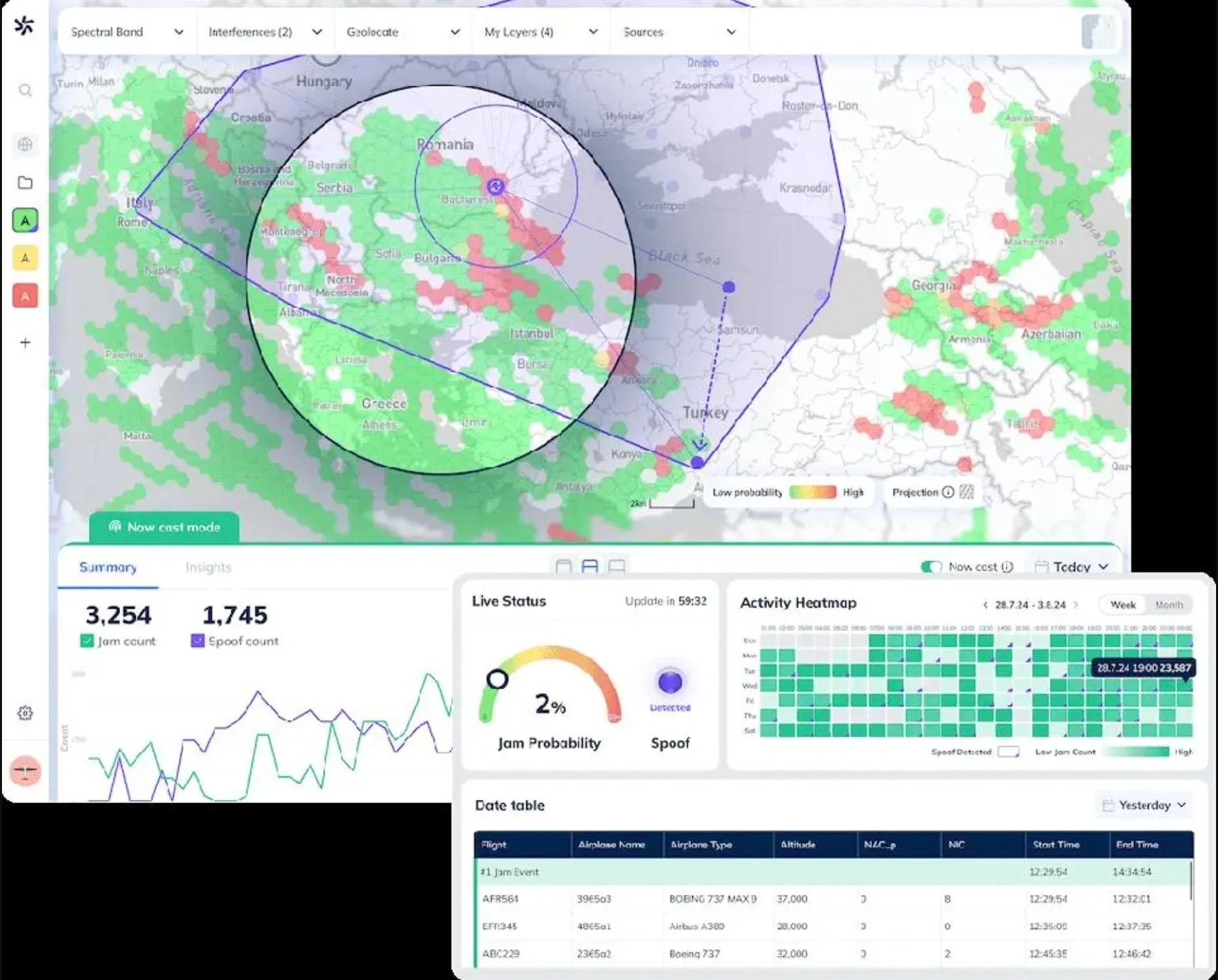 Специальные датчики фиксируют параметрчы сигнала, после чего программное обеспечение в реальном времени строит карту радиообстановки.