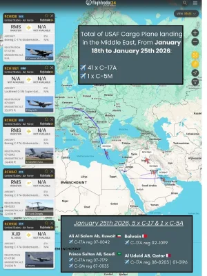 Регион продолжает насыщаться военными грузами преддверии возможной военной операции против Ирана. Наиболее вероятно, что на борту компоненты ПВО, зенитные ракеты и дополнительное высокоточное вооружения для авиации.
