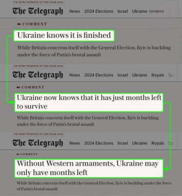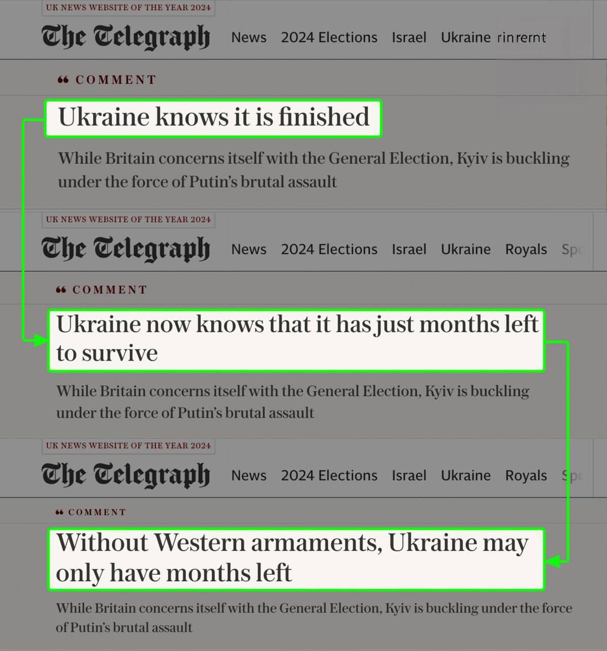 ▪️Начнем с простого примера. Вчера британское The Telegraph с третьей попытки все же опубликовало статью о критическом положении ВСУ.