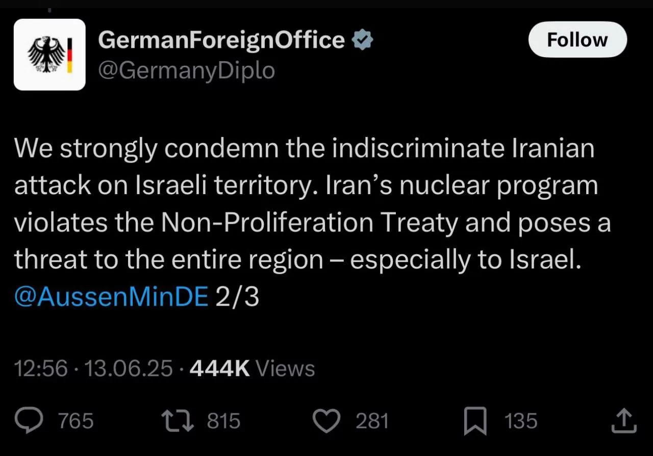 Главная страница » Новости и статьи Анекдот дня — Германия резко осуждает «удары Ирана по Израилю». То, что Израиль с ночи утюжит Иран в сообщениях никак не упоминается Автор из команды сайта Опубликовано 13.06.2025Комментариев 0 Добавь сайт в закладки нажми CTRL+D What’s your Reaction? +1 0 +1 0 +1 11 +1 7 +1 4 +1 1 +1 0 What’s your Reaction? +1 0 +1 0 +1 11 +1 7 +1 4 +1 1 +1 0 Поделись видео: