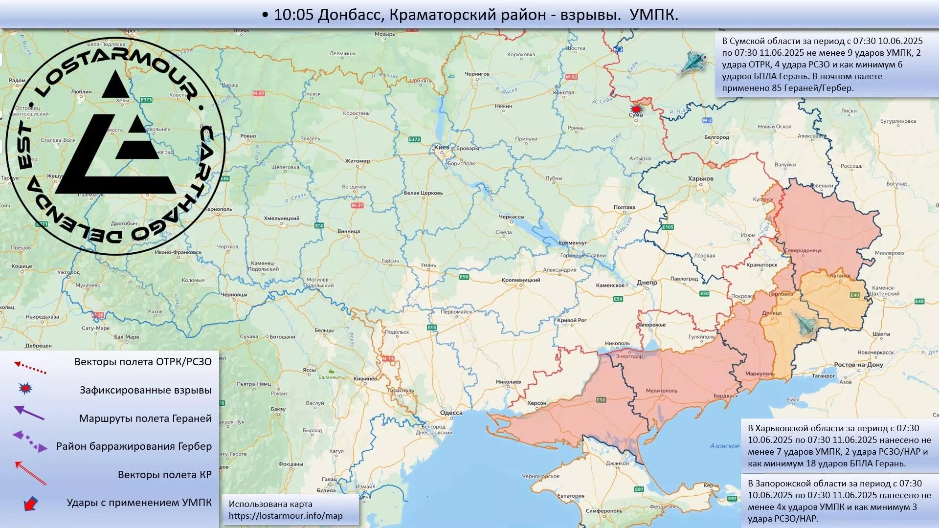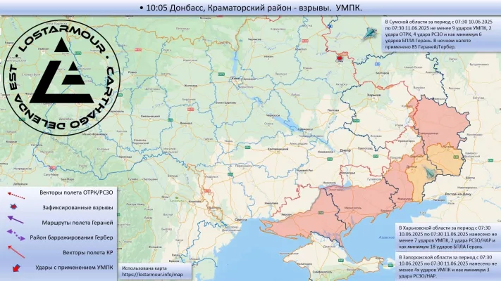 - 03:30-03:45 Купянск, Харьковская область — взрывы. 4 удара УМПК.