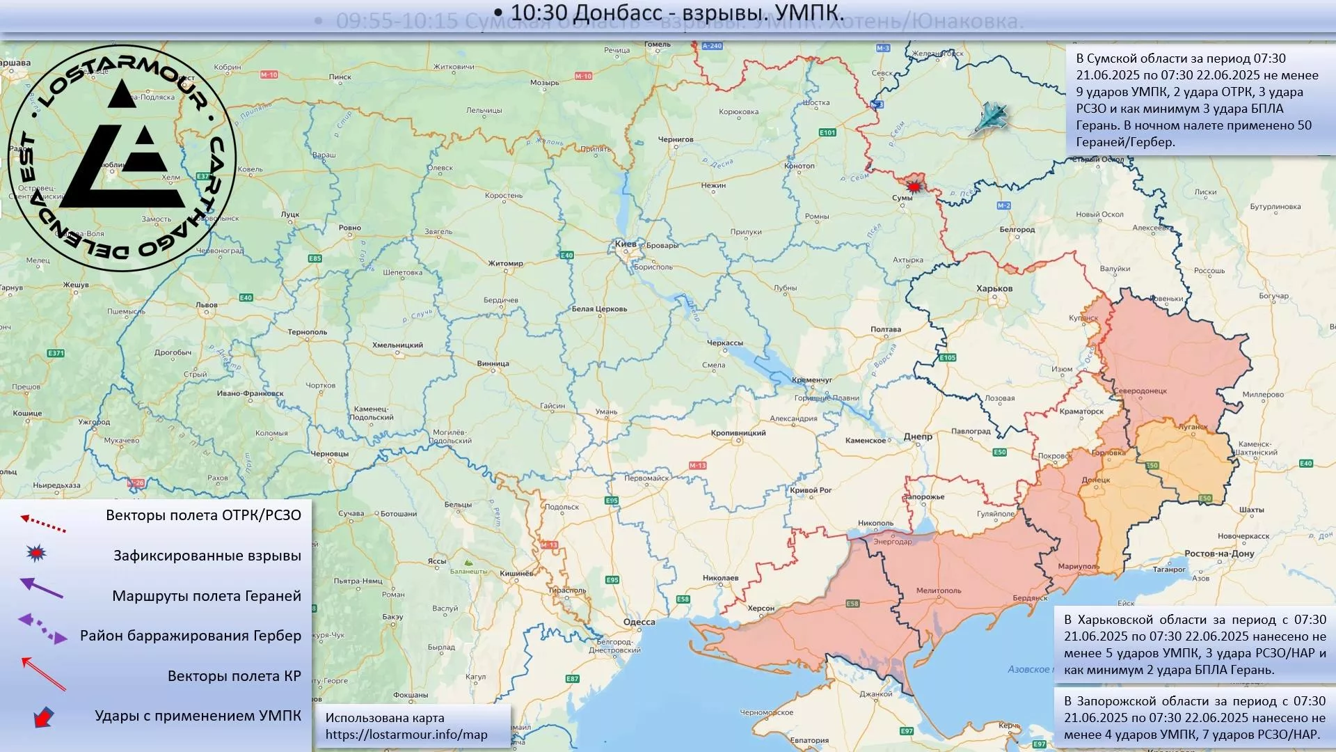 - 21:20 Киевская область и Краматорский район Донбасса — взрывы. Герани/ Герберы и РСЗО соответственно.