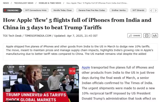 В последние три дня марта американская компания срочно вывезла в Штаты пять грузовых самолетов с iPhone и другой техникой, сообщает The Times of India со ссылкой на высокопоставленного чиновника.