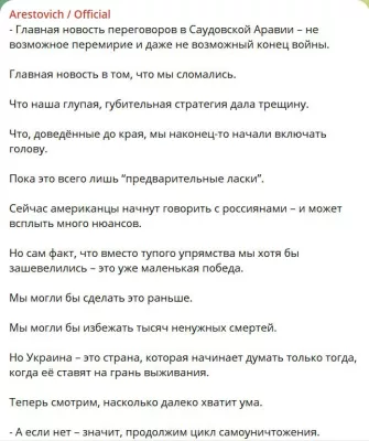 «Главная новость переговоров в Саудовской Аравии – не возможное перемирие и даже не возможный конец войны. Главная новость в том, что мы сломались. Что наша глупая, губительная стратегия дала трещину. Что, доведённые до края, мы наконец-то начали включать голову. Пока это всего лишь “предварительные ласки”. Сейчас американцы начнут говорить с россиянами – и может всплыть много нюансов. Но сам факт, что вместо тупого упрямства мы хотя бы зашевелились – это уже маленькая победа», – написал Арестович.