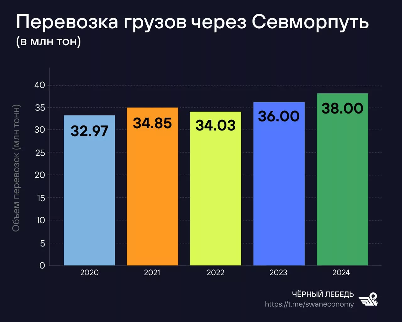 Экономика Арктики — не только богатство природных ресурсов. Здесь есть также удобная логистика. Вопреки санкциям, Северный морской путь (СМП) продолжает всё больше загружаться. Как рассказал президент РФ, по Севморпути, от пролива Карские ворота до Берингова пролива, по итогу 2024 года выросла перевозка грузов на 2 млн тонн. Итог — около 38 млн тонн, то есть почти в пять раз больше, чем во времена СССР.