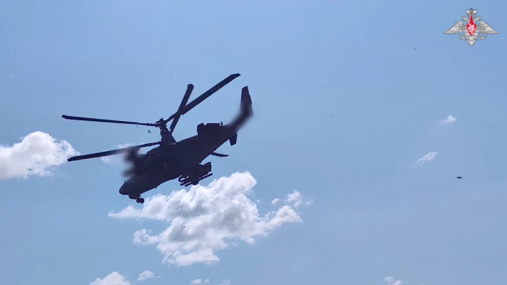 Экипаж армейской авиации на вертолете Ка-52 нанес удар авиационными средствами поражения по живой силе и бронированной военной технике подразделений ВСУ в приграничном районе Курской области.