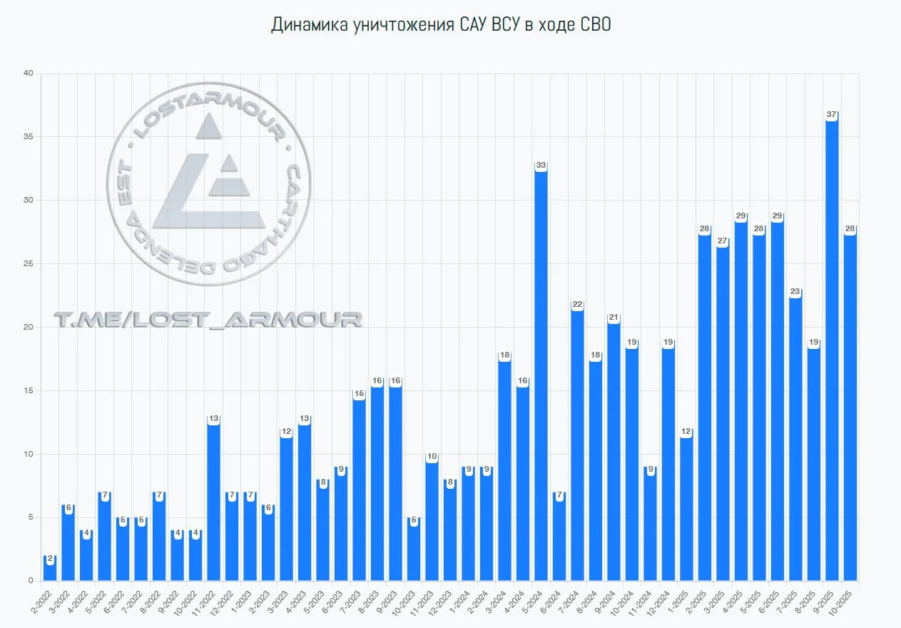 Согласно данным портала LOSTARMOUR только в 2025-году ВСУ потеряли свыше 250 самоходных артиллерийских установок (САУ) — подавляющее большинство потерь пришлось на удары FPV-дронами ВС РФ.