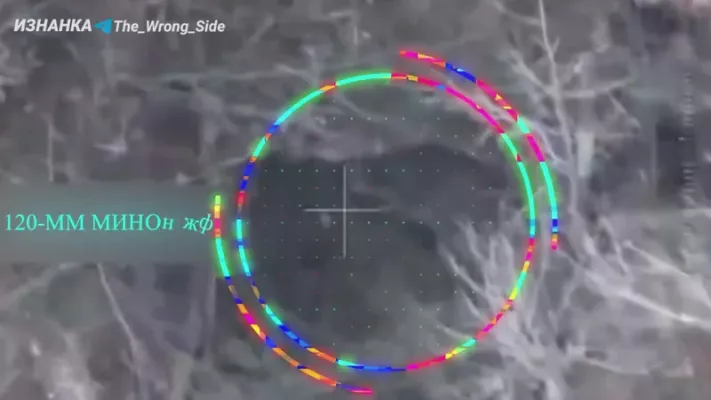 На кадрах ОК замаскированный 120-мм миномёт и его уничтожение прямым попаданием 152-мм снаряда, с последующей детонацией боевого комплекта.