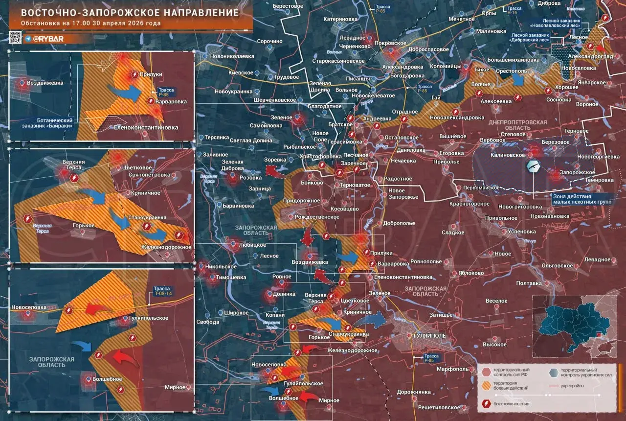 🔸️Наиболее активные боестолкновения по-прежнему идут на западном фланге, в том числе у Гуляйполя. Украинские формирования еще в начале и середине апреля предприняли несколько попыток просачивания силами малых групп и смогли заскочить в населенный пункт Варваровка, где и были поражены ударами дронов.