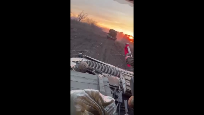 Атака нашей бронетехники на Авдеевском направлении. Получивший попадание беспилотника Т-90M отворачивает, но сохраняет ход.
