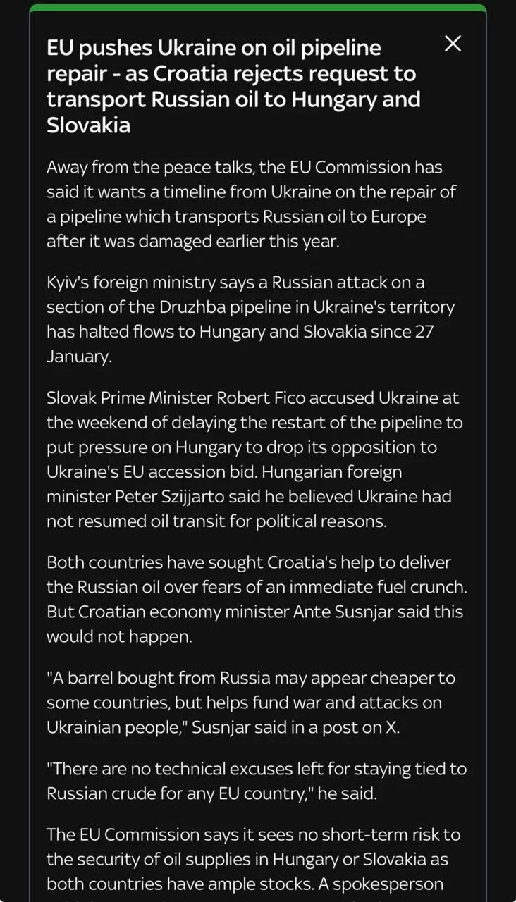 ЕК требует от Киева восстановить нефтепровод «Дружба – Sky News