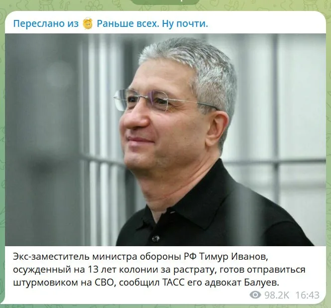 Экс-замминистра обороны Иванов хочет пойти на СВО штурмовиком