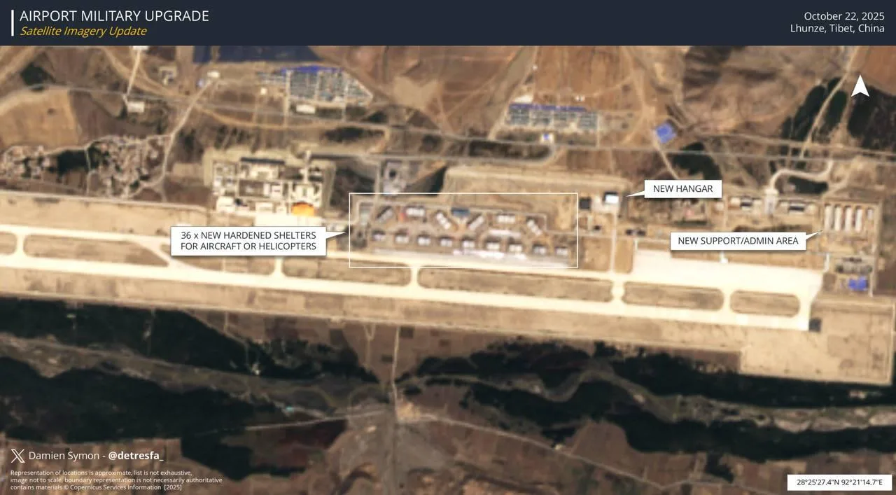 На китайской авиабазе Лунцзе (lhunze), расположенной у границы с Индией в Тибете, с апреля было построено 36 укрепленных укрытий для самолетов