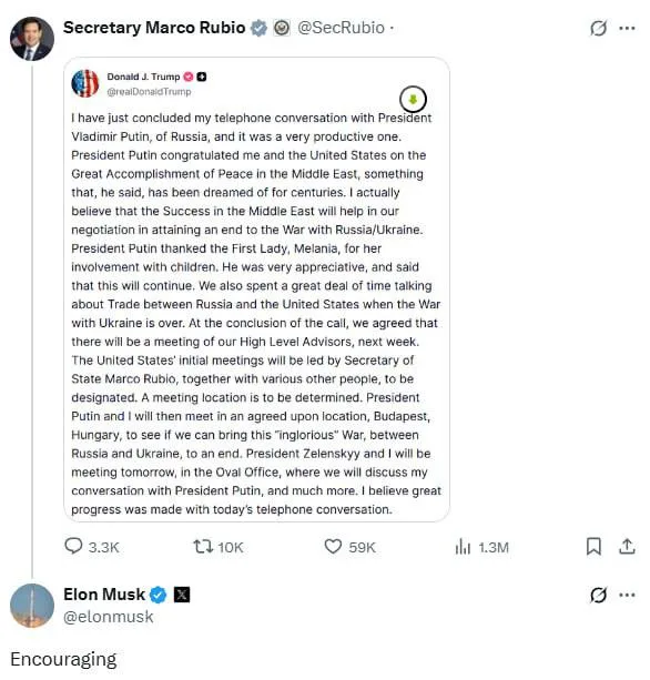 «Обнадеживающе», — Илон Маск лаконично прокомментировал новость о предстоящей встрече Владимира Путина и Дональда Трампа в Венгрии