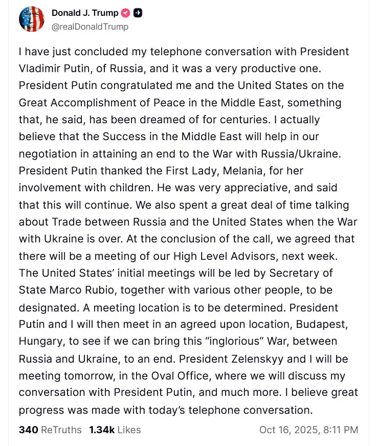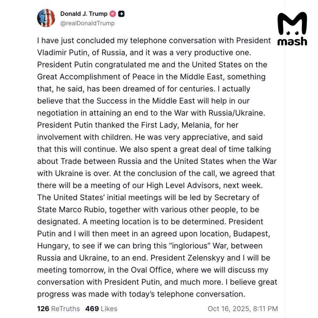 Трамп заявил о «прогрессивном» разговоре с Путиным и переговорах по Украине
