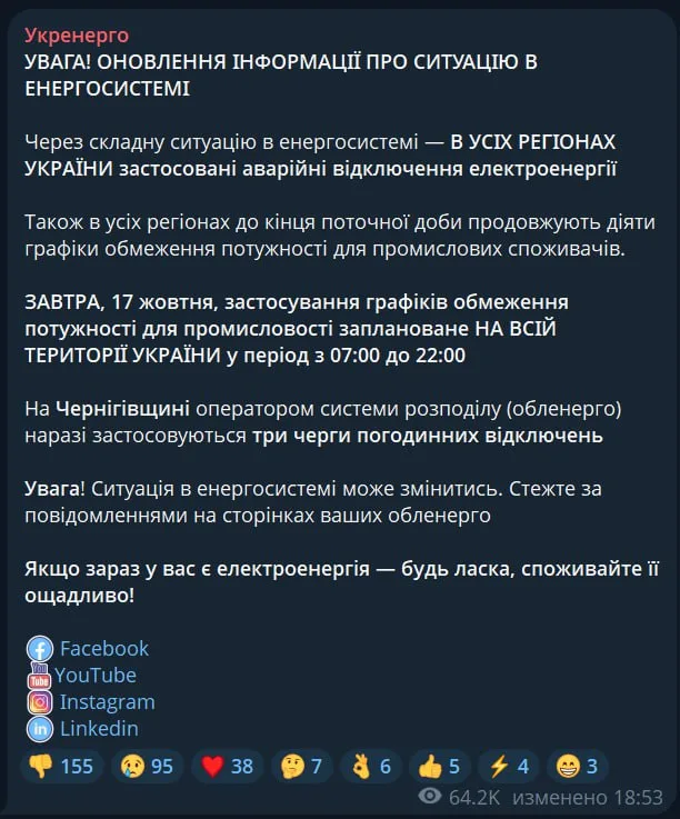 Блэкаут на всей территории Украины, кроме части Черниговской области