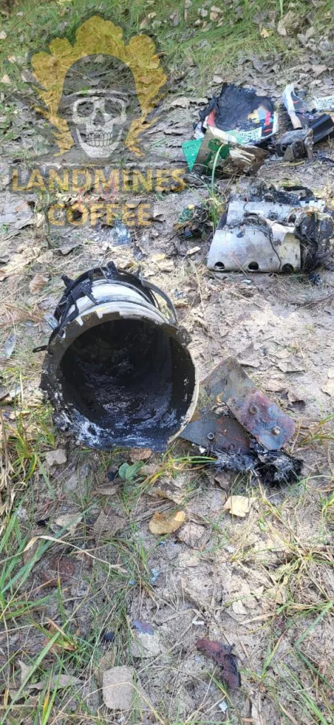 Обломок украинского реактивного боеприпаса «Пекло», обнаруженный где-то на фронте