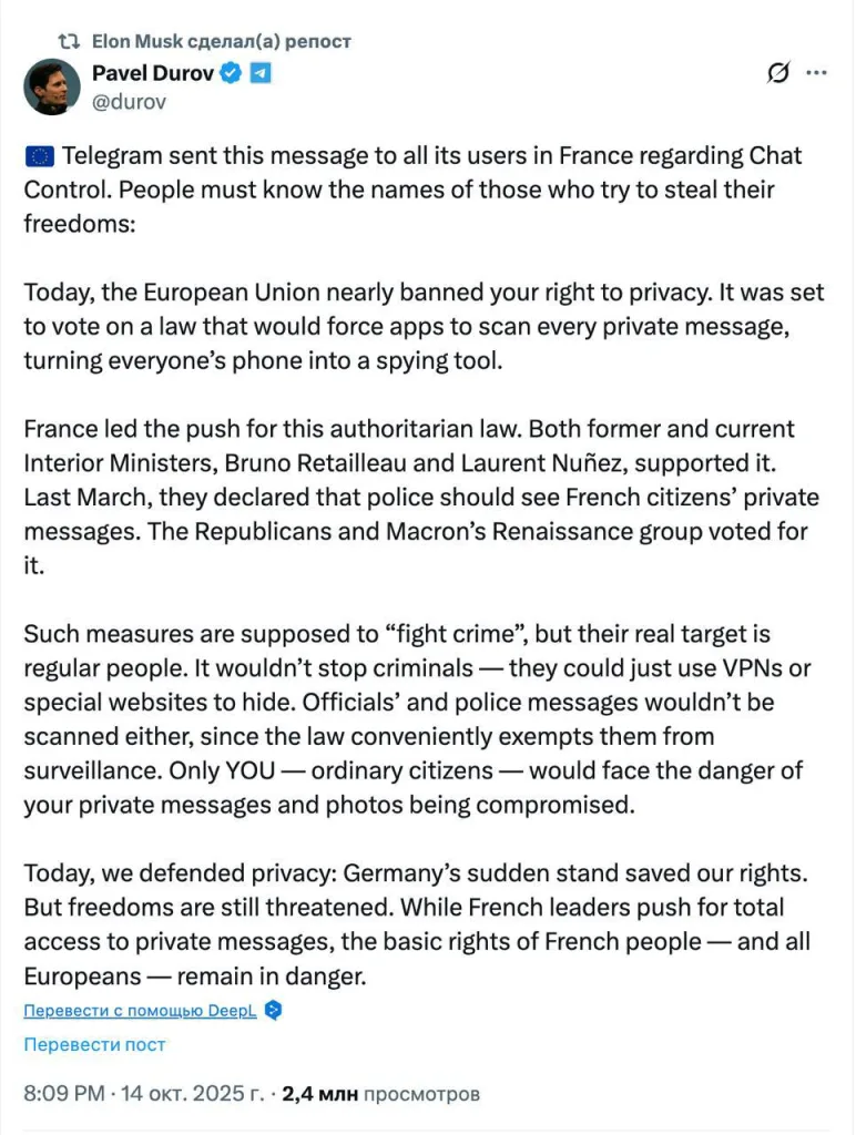 Павел Дуров прокомментировал инициативу ЕС «превратить телефоны всех в инструменты шпионажа»