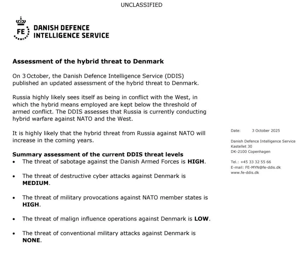 Служба военной разведки Дании (DDIS/FE) опубликовала основные моменты своей оценки, касающиеся гибридной угрозы для Дании со стороны России