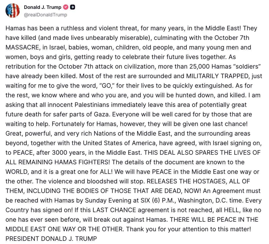 Трамп пообещал ХАМАС, что против них «развернется невиданный ранее ад», если руководство группировки не примет его мирный план в Газе
