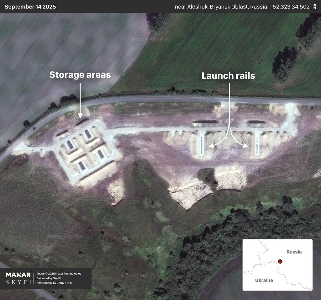 Сообщается о строительстве нового аэродрома для запуска дронов-камикадзе «Герань-2» и дронов-приманок в районе деревни Алешок Брянской области, расположенной в 35 километрах от границы с Украиной