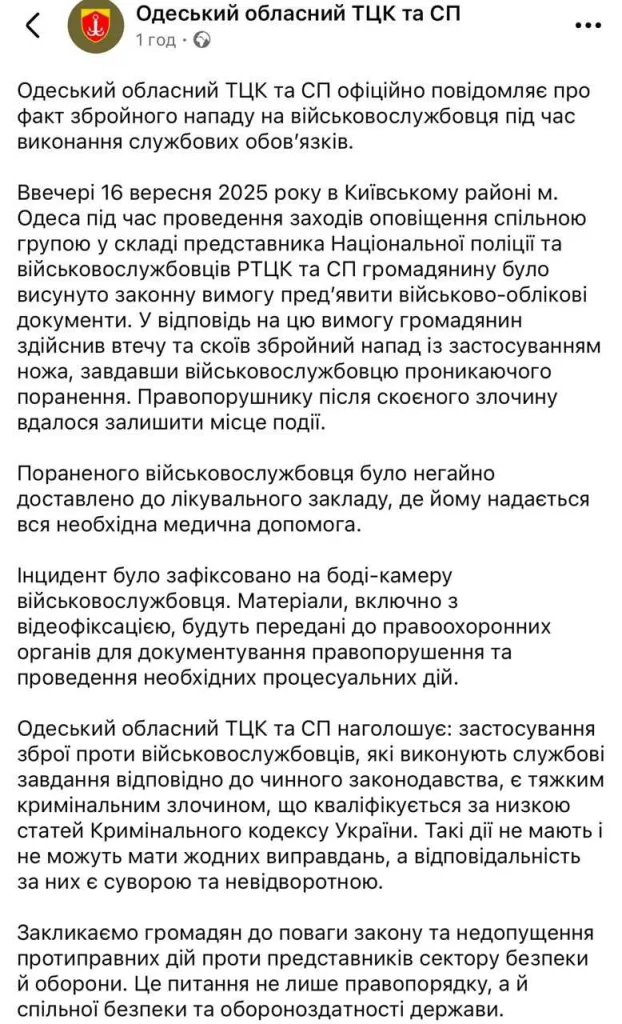 Мужчина ножом ранил военного во время проверки документов в Одессе, — Одесский ОТЦК и СП