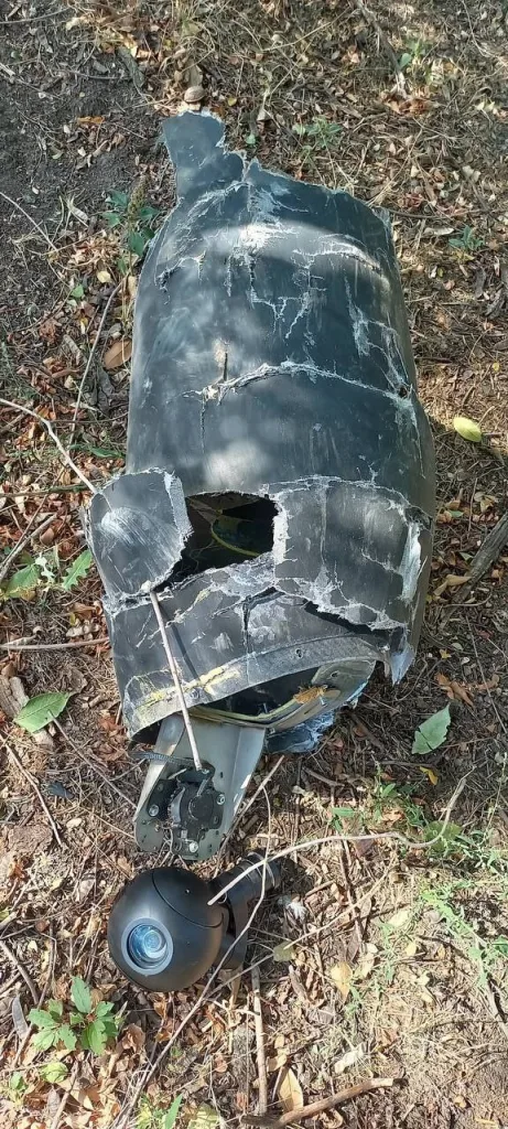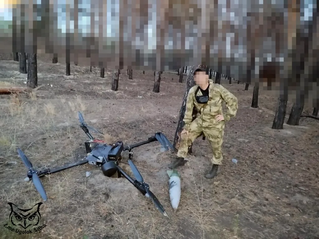 Сбитый вражеский дрон Баба-Яга. Можно оценить размер как самого дрона, так и самодельной бомбы, что он нёс