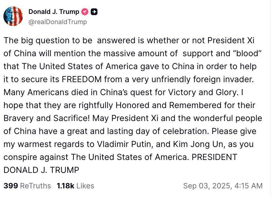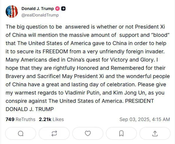 «Многие американцы погибли в стремлении Китая к Победе и Славе», — Трампу не даёт покоя парад в Пекине