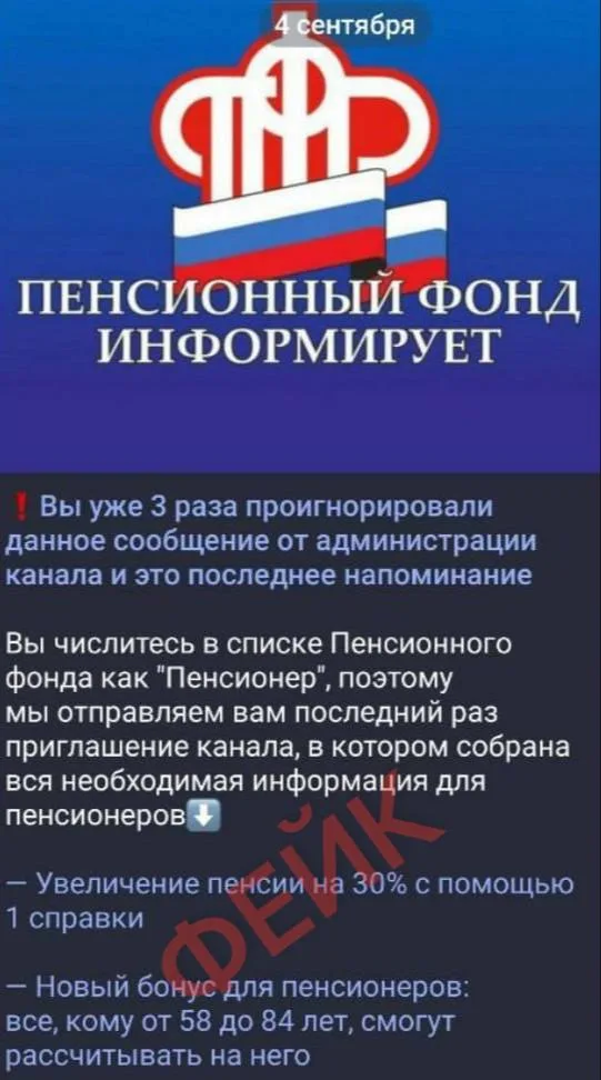МВД предупреждает: мошенники рассылают пенсионерам фейковые сообщения якобы от Пенсионного фонда России, обещая увеличить пенсию на 30%