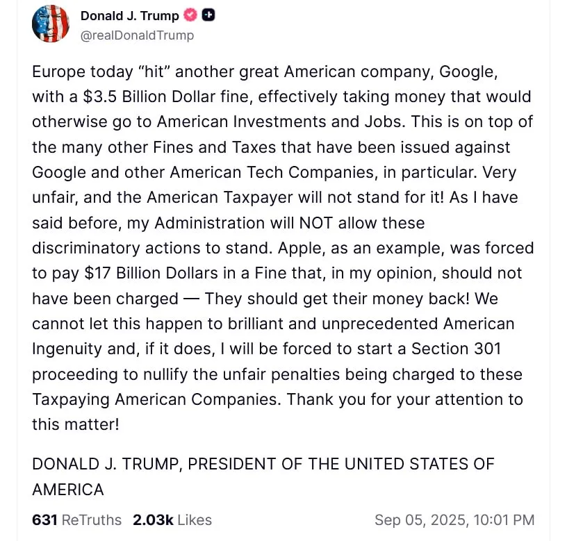 ЕС оштрафовал Google на $3,5 миллиарда: Трамп угрожает тарифами