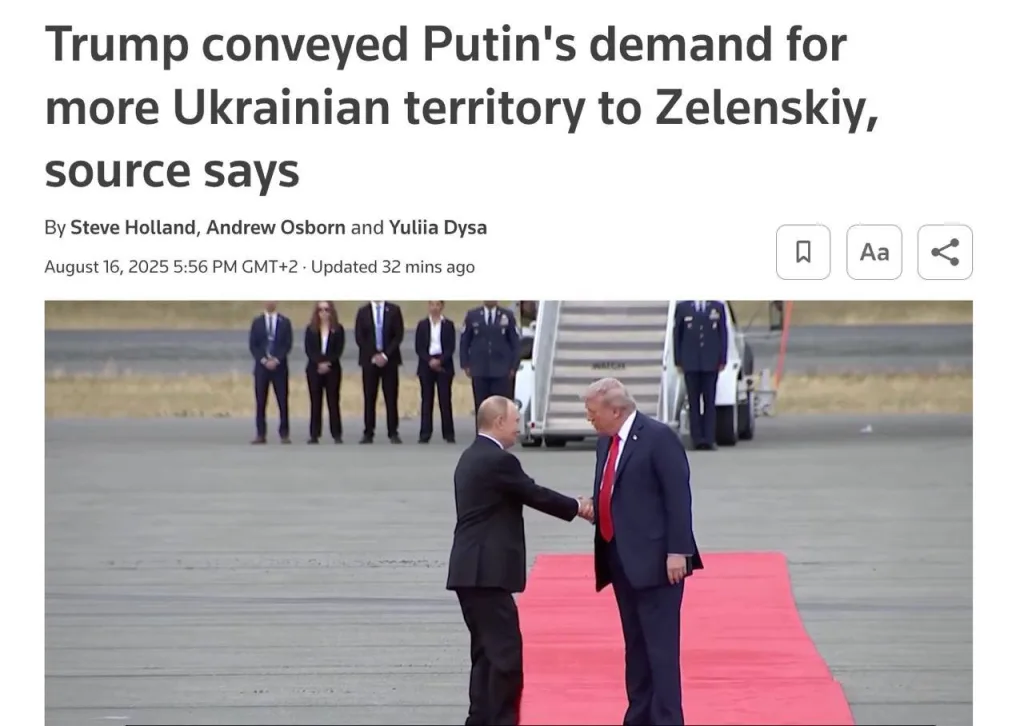 New York Times и Financial Times со ссылками на свои источники пишут, что Владимир Путин в ходе переговоров якобы предложил Дональду Трампу прекратить наступление в Херсонской и Запорожской области, если Украина выведет войска из Донбасса