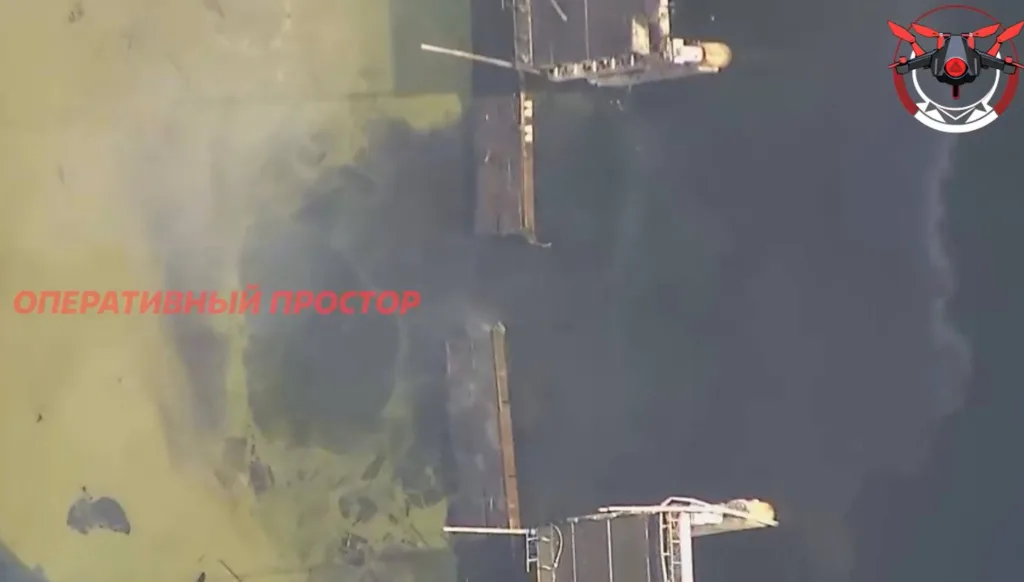 Уничтожение ударом ФАБ-500 с УМПК-ПД понтонной переправы, возведённой у ранее повреждённого моста через реку Северский Донец в районе пгт Райгородок