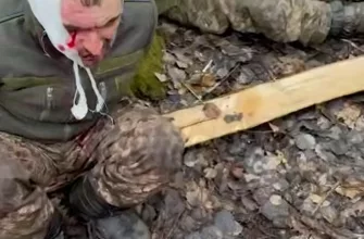 Выживший украинский боевик рассматривает оптоволоконный кабель от русского fpv-дрона, прилетевшего в его автомобиль